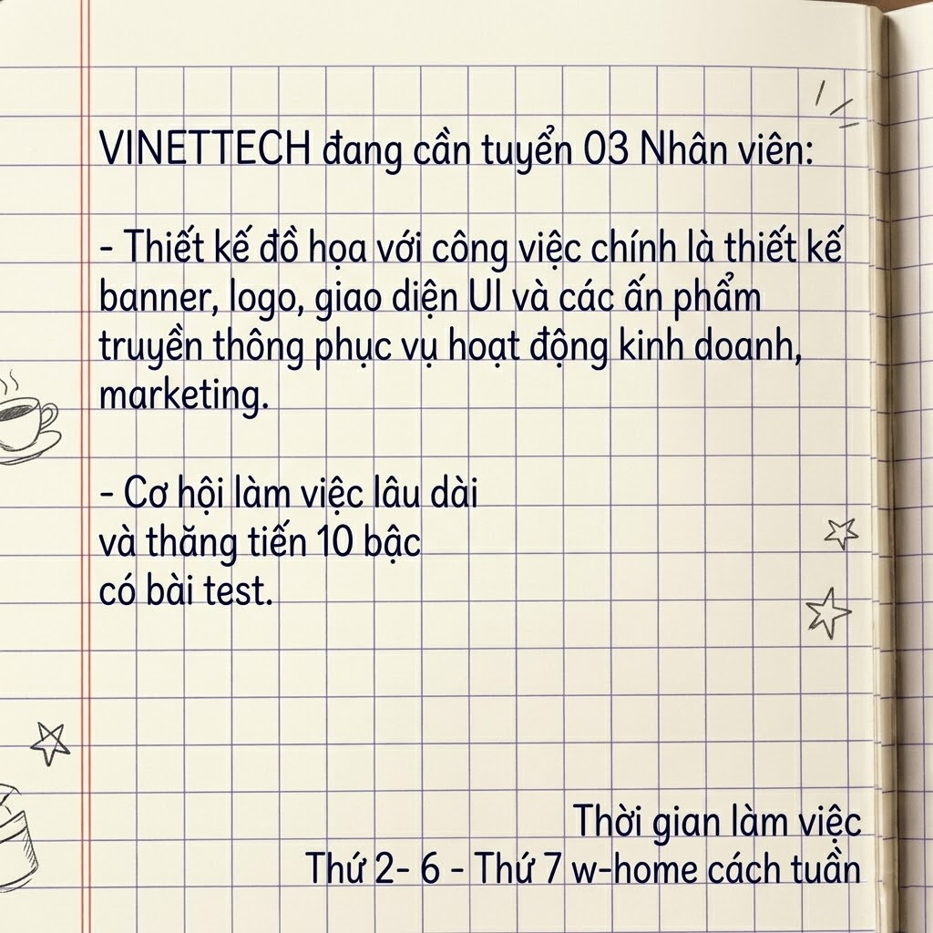 VINETTECH đang cần tuyển 03 Nhân viên Thiết kế đồ họa với công việc chính là thiết kế banner, logo, giao diện UI và các ấn phẩm truyền thông phục vụ hoạt động kinh doanh, marketing.